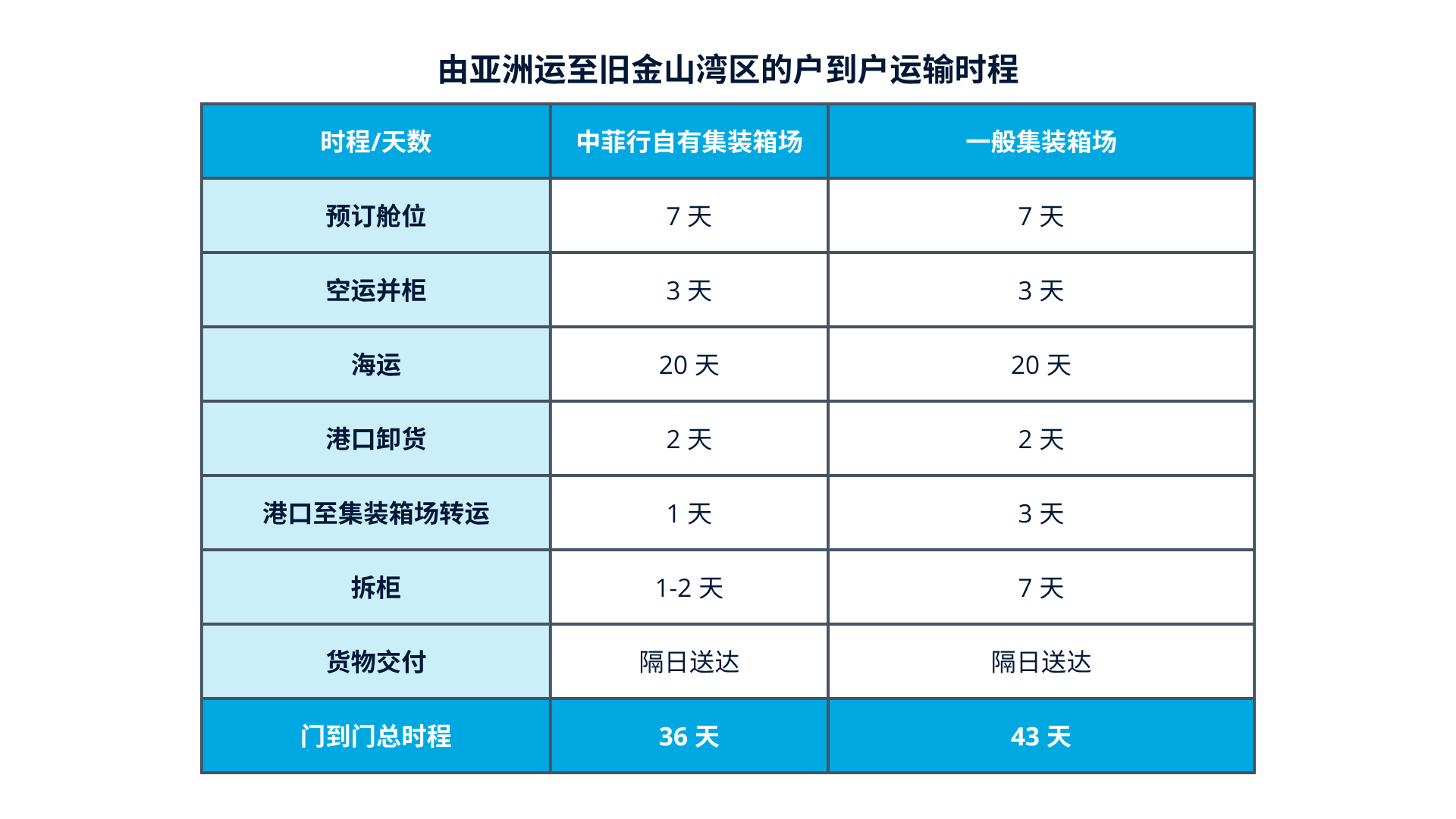 - 自有旧金山集装箱场 CFS,专为来自中国以及台湾地区的进口货物提供快速、可靠的港口至客户配送服务