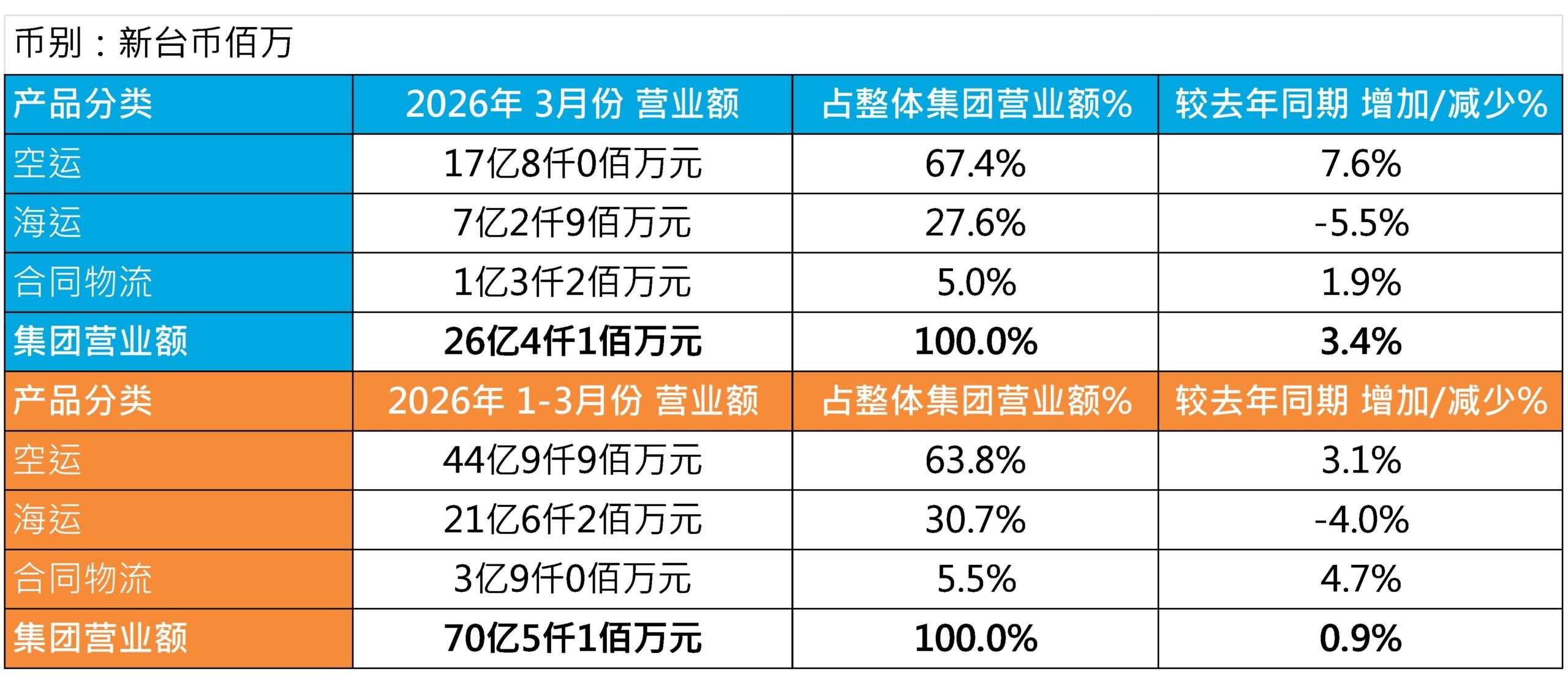 中菲行国际物流股份有限公司(5609)公布,2026年3月自结集团合并营业额为新台币26亿4千1百万元,年增3.4%,月增28.4%。在客户出货需求带动下,空运货运量较去年同期成长近两成、月增达四成;海运货运量则与去年同期大致持平、月增约一成,整体货运量维持稳健成长。惟受市场运价较去年同期下滑影响,营收表现略受压抑。累计2026年第一季,集团空运货运量年增约两成、海运货运量年增近一成,合并营业额达新台币70亿5千1百万元,年增0.9%,展现稳健营运韧性。
