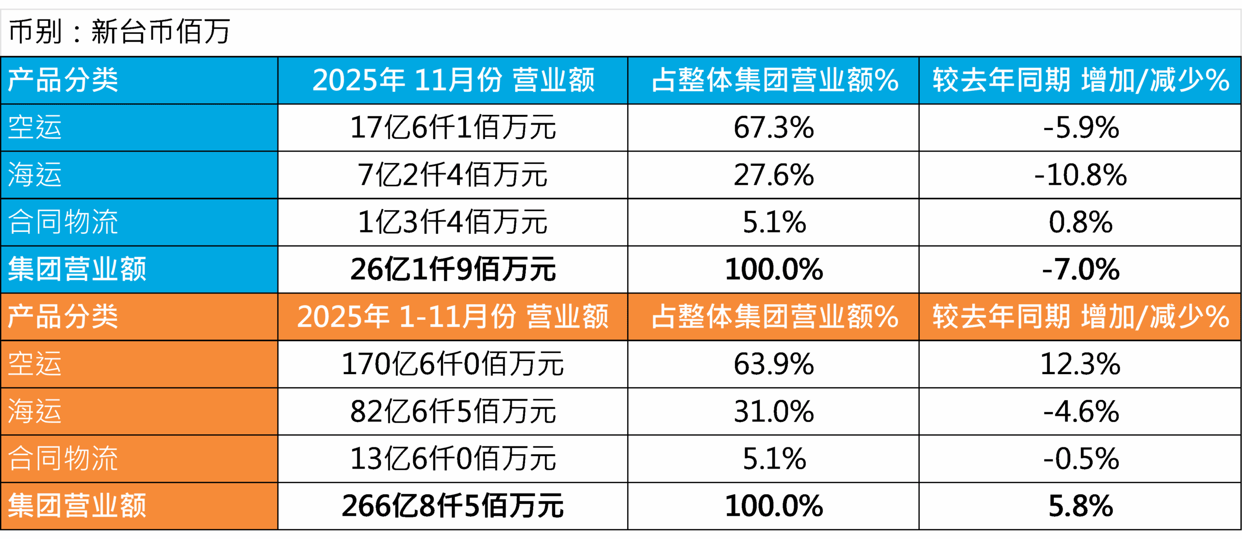 中菲行国际物流股份有限公司(5609)114年11月份自结集团营业额新台币26亿1仟9佰万元,较去年同期减少7%,较10月增加11.9%,为今年度单月营收新高。受空、海运货运量同步成长带动,11月空、海运货运量较去年同期成长近二成,亦较上个月增加逾一成,但是由于运价较去年同期下降,以致营业额的增长受到影响;累计1月至11月空、海运货运量较去年同期成长约二成,集团合併营业额则为266亿8仟5佰万元,年增5.8%。