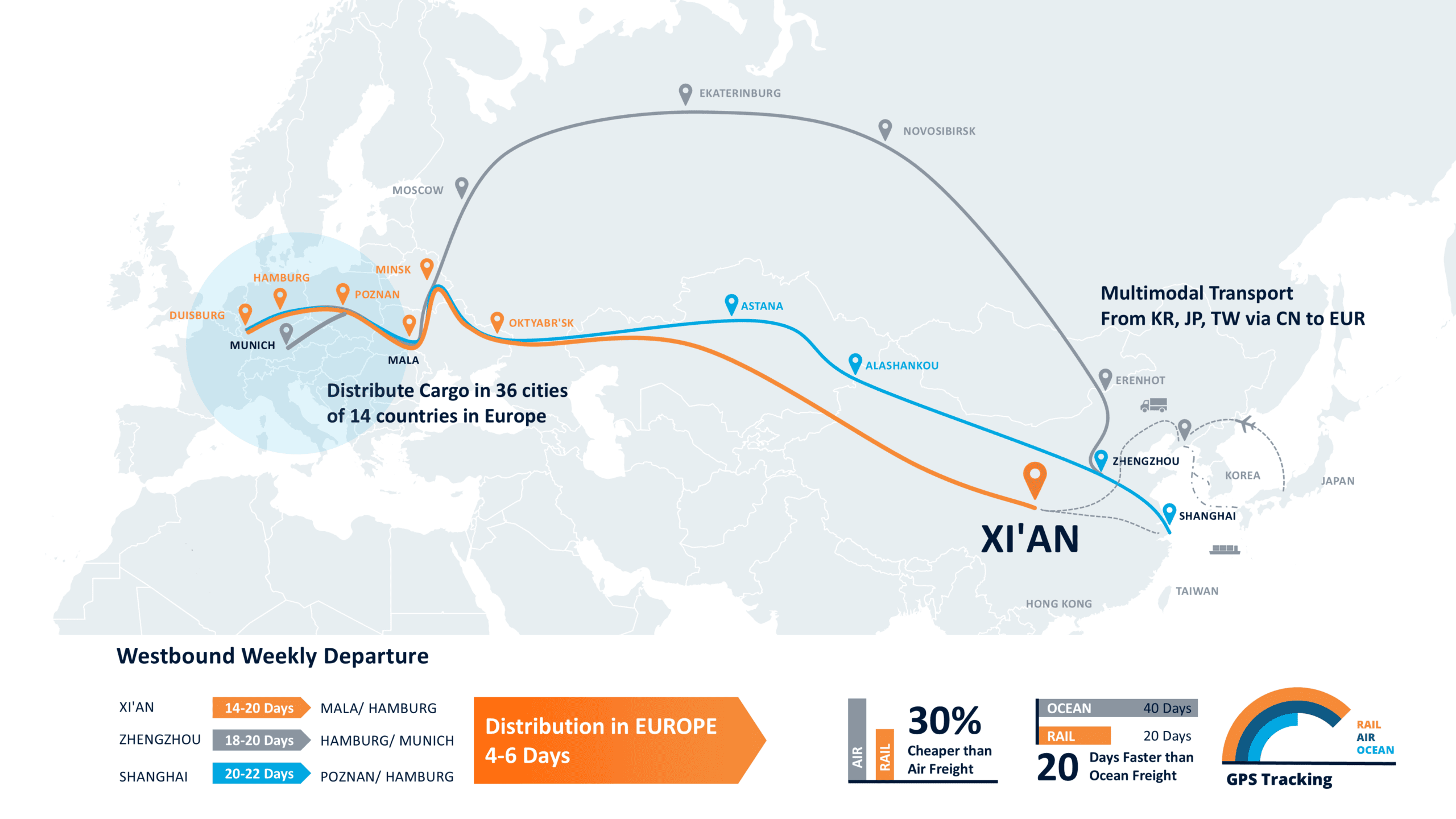 铁路开启了中欧间的现代丝绸之路。 2016年开始,中菲行中国到欧洲配送解决方案透过铁路从苏州和我们西安的铁路枢纽运输货物。货物经由东欧,到达欧洲各国主要配送中心。